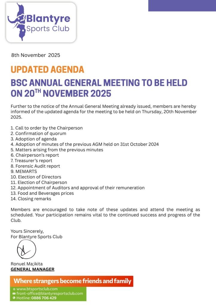BSC ANNUAL GENERAL MEETING TO BE HELD ON 20TH NOVEMBER 2025